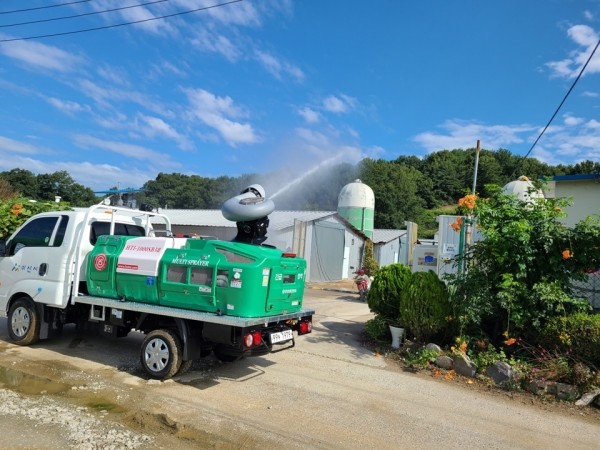 새로 구매한 방역소독 차량은 1t 차량에 800ℓ 소독약을 탑재할 수 있도록 맞춤 제작했으며, 자동변속 기어를 장착하고 물 보충과 소독약 희석이 편리하도록 소독약 탑재 부분을 낮춰 비상시에는 축수산과 직원 누구나 방역에 임할 수 있도록 했다.