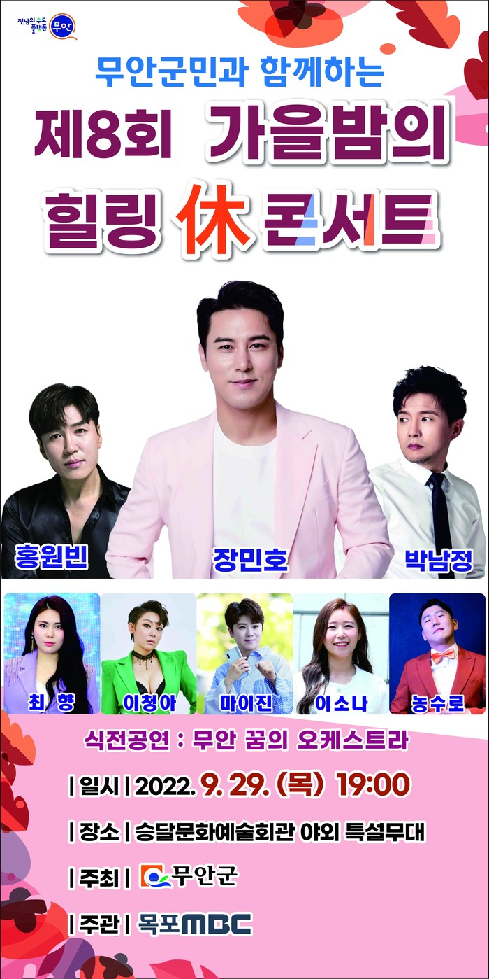 전남 무안군(군수 김산)은 무안군민을 위한 제8회 가을밤의 힐링 휴(休)콘서트를 오는 9월 29일 저녁 7시 승달문화예술회관 야외특설무대(무안군 무안읍 창포로 8)에서 개최한다고 밝혔다.