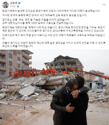 김동연 경기도지사는 7일 자신의 사회관계망서비스(SNS)에 “대한적십자사를 통해 100만 달러의 구호금을 전달하겠다”면서 “커다란 충격과 슬픔에 빠진 양국 국민 여러분께 깊은 위로의 말씀을 드린다. 의료, 구호, 구조 등 가능한 지원을 아끼지 않겠다”고 밝혔다.