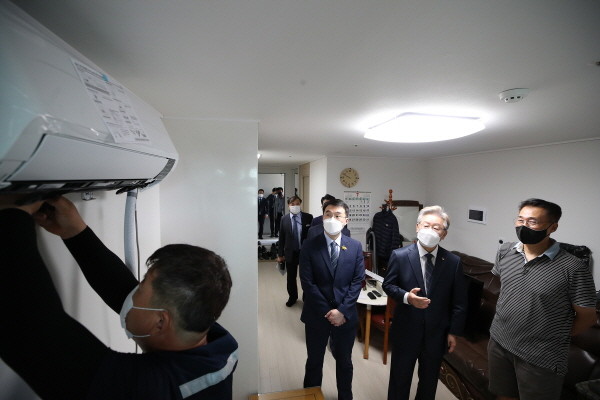 ▲ 5일 오전 수원시 영통구 소재 GH 광교원천 행복주택에서 이재명 경기도지사가 주거약자 세대를 방문해 에어컨 설치 현장을 확인하고 있다.(사진=경기도) |