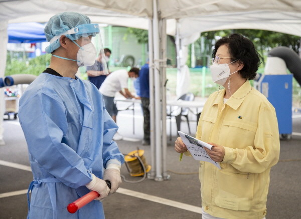 이날 검사소를 찾은 박은경 의장은 폭염 속에서 방역 활동에 임하고 있는 근무자들의 노고를 격려하고 외국인 근로자들에 대한 통역과 온열 대책의 미비점은 없는지 확인했다. 또 검사소를 방문한 시민들이 관련 서류를 작성하는 일을 돕기도 했다.