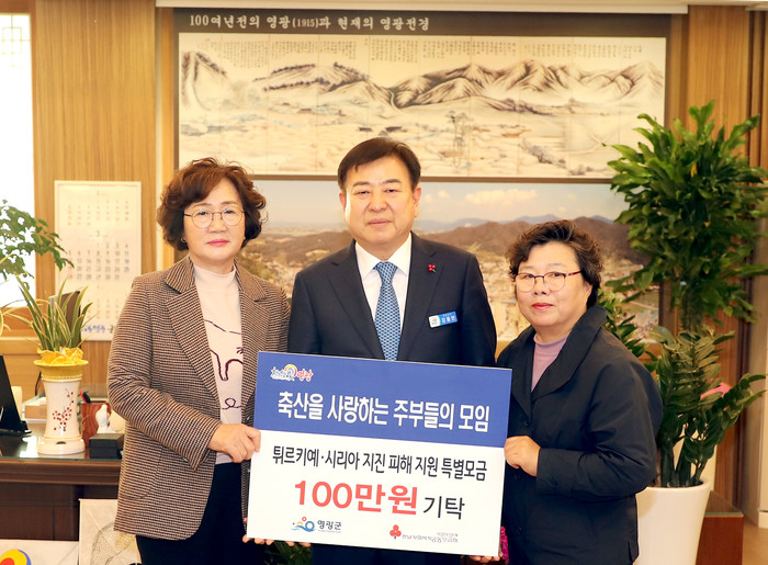 | ▲ 축산을 사랑하는 주부들의 모임에서 지난 7일 영광군에 성금 100만 원을 기탁하였다.(사진제공=영광군) |