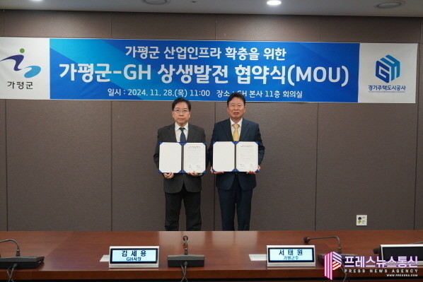 [프레스뉴스] 류현주 기자= 경기주택도시공사(GH)는 28일 광교 GH 본사에서 김세용 GH 사장, 서태원 가평군수가 참석한 가운데 가평군과 ‘가평군 산업인프라 확충을 위한 가평군-GH 상생발전 협약’을 체결했다고 밝혔다.