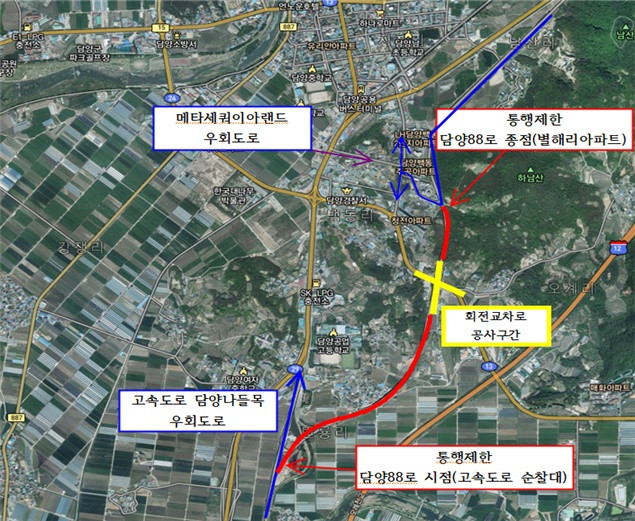 [전남=프레스뉴스] 박정철 기자= 담양군(군수 최형식)은 국도13호선 오계지구 교차로 개선공사를 위해 사업 구간 내에 국도13호선과 교차되는 (구)88고속도로를 내달 12일부터 2021년 11월 30일 까지 전면 통제한다고 밝혔다.