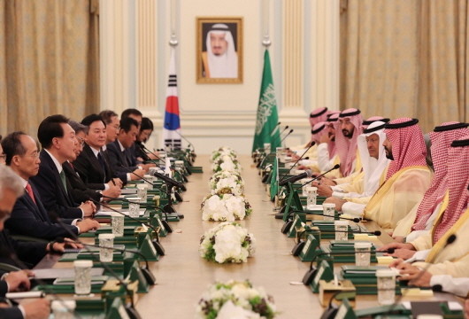 | ▲윤 대통령이 22일(현지시간) 리야드의 야마마궁에서 모하메드 빈 살만 빈 압둘아지즈 알 사우드 왕세자 겸 총리와 한·사우디 확대회담을 하고 있다.(사진=대통령실) |