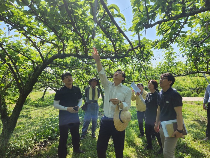 ▲우승희 영암군수 덕진면 이상저온 과수 피해 농가 방문/영암군 제공 |