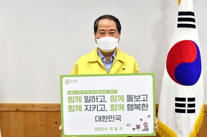 [전남=프레스뉴스] 박정철 기자= 최형식 담양군수가 25일 ‘저출산 극복 함께해요! 범국민 포(4)함 릴레이 챌린지’에 동참했다.