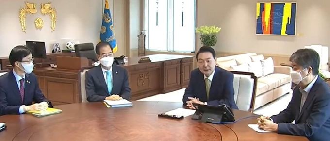 | ▲ 윤 대통령과 한덕수 국무총리 첫 주례회동.(사진= KTV방송 캡쳐본) |