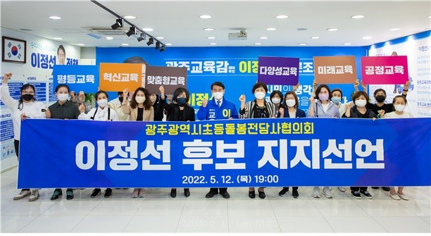 초등돌봄전담사협의회는 12일 이정선 후보 선거사무실을 찾아 이 후보에 대한 지지를 공식 천명했다. 김영선 돌봄 협의회 회장은 “이 후보는 돌봄전담사의 고충과 어려움을 누구보다 잘 헤아리고 있으며, 광주교육의 발전을 도모할 수 있는 후보로서 지지를 표명한다”고 밝혔다.