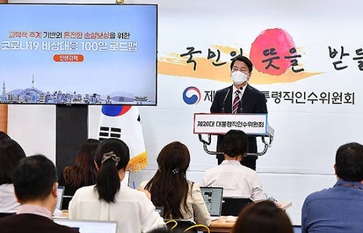 ▲28일 안철수 인수위원장이 서울 통의동 인수위 기자회견장에서 과학적 추계 기반의 온전한 손실보상을 위한 코로나19 비상대응 100일 로드맵을 발표하고 있다.(인수위사진기자단) |