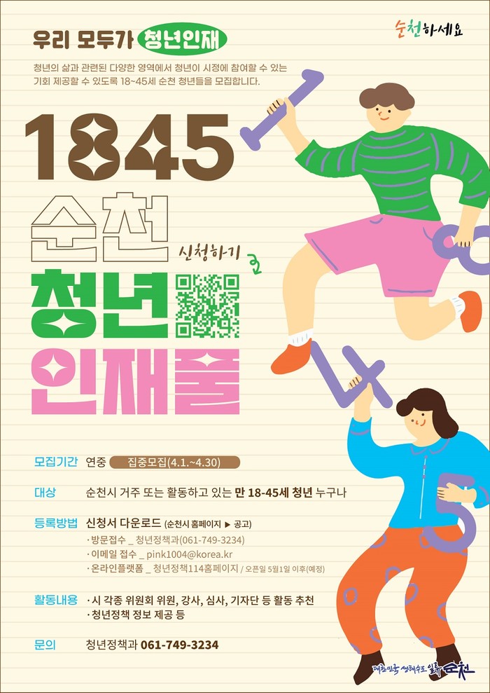 ‘1845순천청년인재풀’이란 18~45세까지의 청년 참여를 확대하고 시에서 구성·운영하는 각종 위원회, 청년강사 등 인력 충원이 필요할 때 적합한 인력을 미리 확보하기 위해 인력을 상시 등록하는 제도이다.