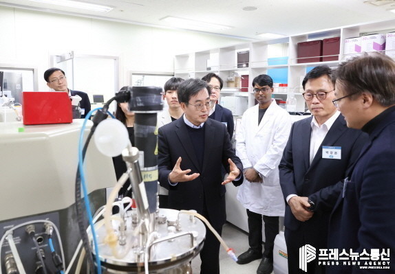 | ▲ 8일 오전 김동연 경기도지사가 경기바이오센터 내에 입주기업을 방문하고 있다.(사진=경기도) |