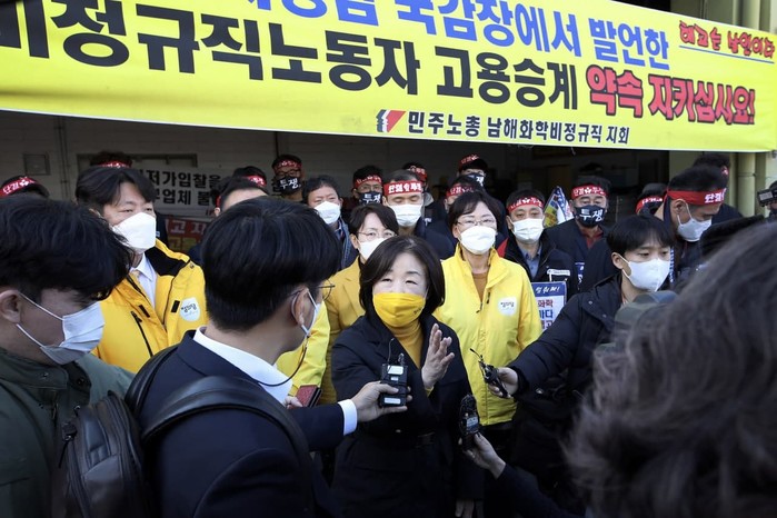 정의당 전남도당은 오늘 남해화학 비정규직 노동자들이 겪고 있는 아픔과 고통은 비단 33명만의 문제로 보지 않는다. 그것은 차별받는 모든 비정규직의 문제로 비정규직의 생존권을 담보로 자행되는 모든 탄압은 사회적 살인으로 규정하고 적극적으로 대응할 것이다.
