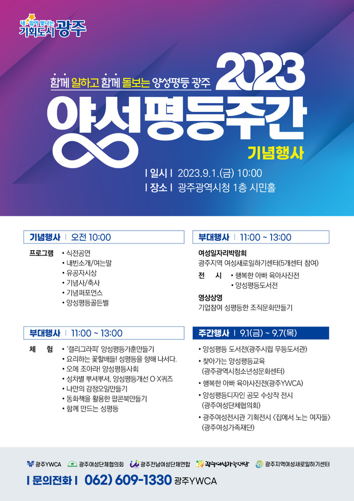 [광주=프레스뉴스] 강래성 기자= 광주광역시(시장 강기정)는 양성평등주간(9월 1~7일)을 맞아 9월 1일 시청 1층 시민홀에서 ‘2023년 양성평등주간 기념행사’를 개최한다.