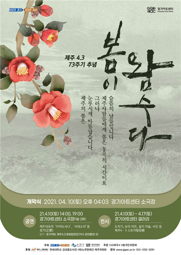 제주 4·3 제73주기 추념 <봄이 왐수다>는 제주 4·3 제73주기를 맞아 희생된 제주도민을 추모하기 위해 (사)제주4ㆍ3 범국민위원회와 경기도, 수원시, 경기아트센터가 마련한 공연과 전시회다.