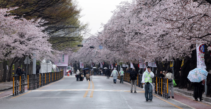 | ▲봄비가 내리는 6일 서울 영등포구 윤중로에서 열린 여의도 벚꽃축제를 찾은 시민과 외국인 관광객들이 벚꽃길을 걷고 있다./사진-뉴스1 |
