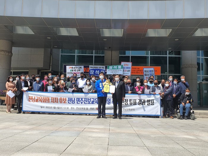 전남교육회의는 4일 오후 1시30분 전남교육청 현관 앞에서 전남 민주진보교육감 투표 결과발표 기자회견을 열었다. 이번 투표는 개인 80%, 단체 20% 비율로 진행됐으며 개인+단체 통합 투표율은 59.9%였다. 개인+단체 통합 투표 결과 찬성 88.7%, 반대 11.3%로 장석웅 예비후보가 전남교육회의의 전남 민주진보교육감 단일후보로 선정됐다.