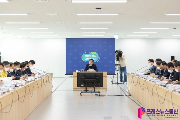| ▲ 7일 오전 경기도청 4층 다목적회의실에서 김동연 경기도지사와 오병권 행정1부지사, 염태영 경제부지사, 조선호 소방재난본부장, 실국장 등이 참석한 가운데 주간 실국장회의가 열리고 있다.(사진=경기도) |