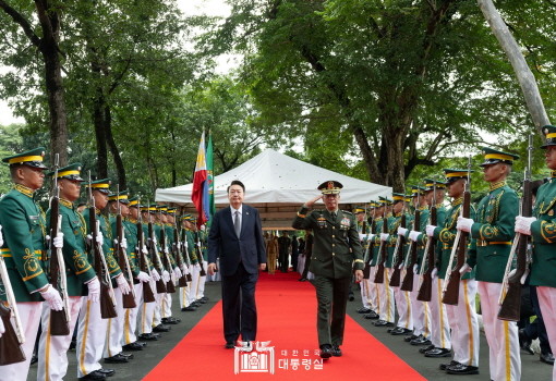 | ▲필리핀을 국빈 방문 중인 윤 대통령이 6일(현지시간) 필리핀 마닐라 영웅묘지 내 한국전 참전 기념비를 방문, 의장대의 사열을 받으며 이동하고 있다.(사진= 대통령실) |