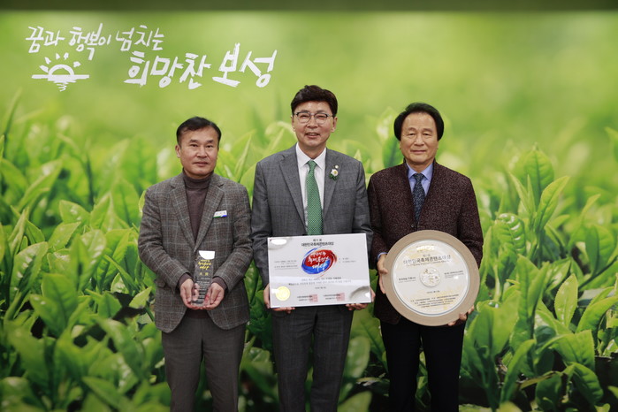 [전남=프레스뉴스] 강래성 기자= 24일 보성군은 김기성 문화관광과장(왼쪽), 김철우 보성군수(가운데), 김현진 서편제 보성소리축제 추진위원장(오른쪽)이 제11회 대한민국 축제콘텐츠 대상 수상 기념 촬영을 했다.