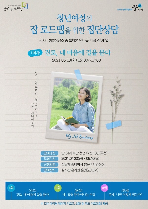 재단은 ‘꿈날개’를 통해 오는 5월과 6월, 10월에 총 3회에 걸쳐 실시간 온라인으로 ‘청년 여성 잡 로드맵을 위한 집단상담’을 운영한다. 진로, 취업, 관계와 같이 청년들의 주된 관심사를 반영 ▲진로, 내 마음에 길을 묻다(1회차) ▲내 일을 찾아 떠나는 여정(2회차) ▲관계, 나만 이렇게 힘든가?(3회차)에 따라 주제별로 진행한다.