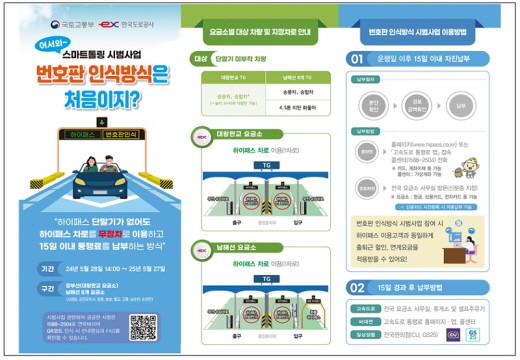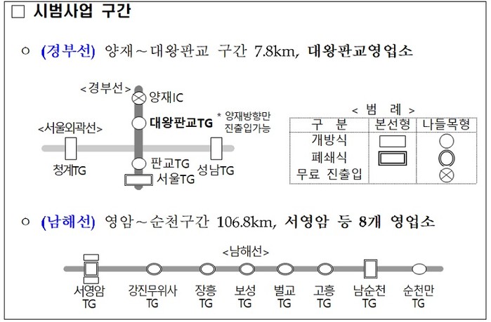 시범사업 구간에서는 하이패스가 없는 차량도 하이패스 차로를 이용해 정차 없이 요금소를 통과할 수 있고, 번호판 인식방식 차로를 이용한 차량의 통행료는 신용카드 사전등록 방식과 자진납부 방식 중 선택 납부할 수 있다.