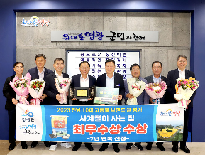 [전남=프레스뉴스] 차윤기 기자= 전남 영광군(군수 강종만)은 지난 6일 전라남도에서 개최한 「2023년 전남 10대 고품질 브랜드 쌀」 시상식에서 “사계절이 사는 집”이 최우수상을 수상 2,500만 원의 인센티브를 받았으며, 7년 연속 선정되는 영예를 안았다고 밝혔다.