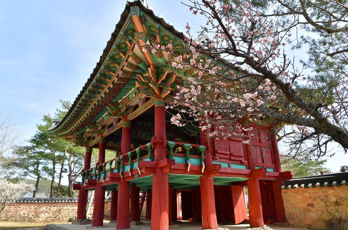 유네스코 세계문화유산 장성 필암서원에는 선비의 절개를 뜻하는 붉은 매화가 가지마다 맺혔다.