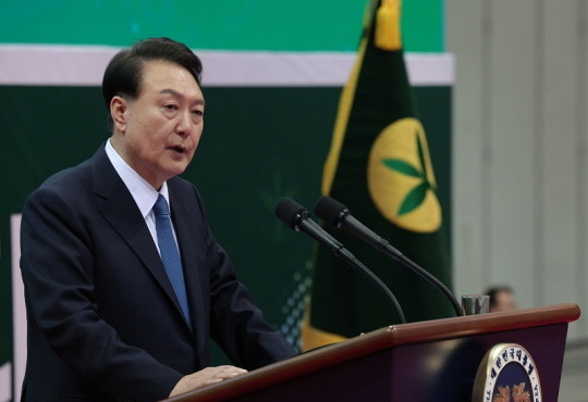 | ▲윤 대통령이 12일 경기 고양시 킨텍스에서 열린 2023 전국새마을지도자대회 ‘청년의 약속’ 선포식에서 축사하고 있다.(사진=대통령실) |