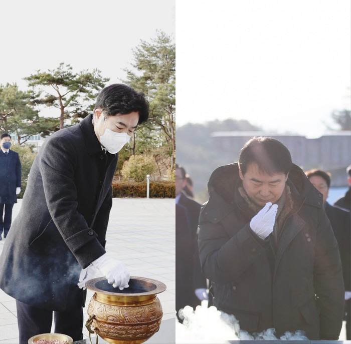 이날 강기정 시장은 어두운 색의 넥타이, 코트를 입은 차림으로 참배에 참여한 반면 이정선 교육감은 진한 회색 계열의 파카를 입고 참배에 참여해 대조를 보였다.