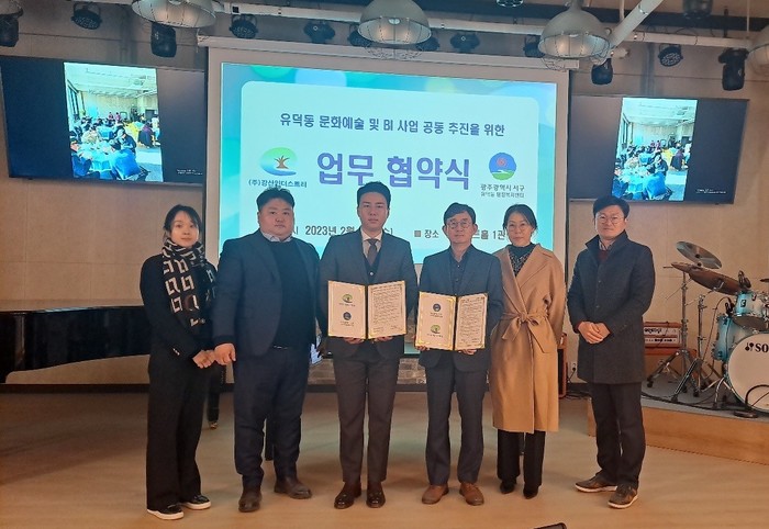 [광주=프레스뉴스] 강래성 기자= 광주 서구 유덕동 행정복지센터(동장 이종준)는 지난 15일 서구 강산아트홀1관에서 청년기업 ㈜강산인더스트리(대표 신범식)와 마을 문화예술활동 지원 및 BI(Brand Identity) 사업 공동추진을 위한 업무협약을 체결했다.