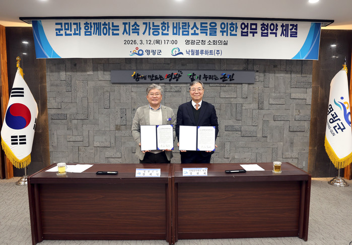 [전남=프레스뉴스] 강래성 기자= 영광군은 지난 12일 영광군청 소회의실에서 ‘영광 낙월 해상풍력 발전사업’을 추진 중인 낙월블루하트㈜(대표 강현재)와 군민과 함께하는 지속 가능한 바람소득을 위한 업무 협약을 체결했다고 밝혔다.