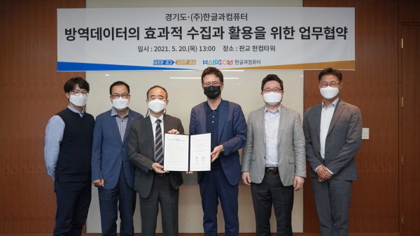 임문영 경기도 미래성장정책관과 김대기 ㈜한글과컴퓨터(한컴) 총괄부사장은 20일 성남 판교 한컴타워에서 ‘방역데이터의 효과적 수집과 활용’을 위한 업무협약(MOU)을 체결했다.