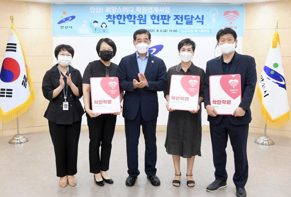 안산시(시장 윤화섭)는 6일 ‘안산! 희망스터디’ 사업에 참여하는 학원 34개소를 ‘착한학원’으로 선정하고 인증 현판을 수여했다.