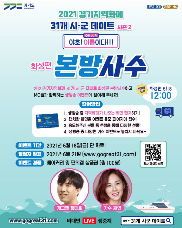 [프레스뉴스] 강보선 기자= 경기지역화폐를 알리기 위한 비대면 행사인 ‘경기지역화폐 31개 시군 데이트’(부제: 야호! 여름이다!!!)가 18일 화성 전곡항에서 시즌2 시작을 알렸다.