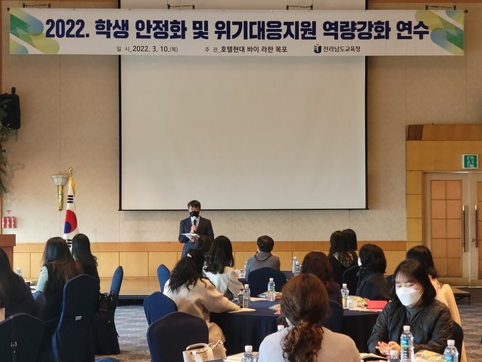 [전남=프레스뉴스] 강래성 기자= 전라남도교육청이 3월 10일(목) 호텔현대 바이 라한 목포에서 도내 Wee센터 위기학생 지원 업무담당자와 임상심리사 등 50명이 참석한 가운데 학교 안정화 지원을 위한 ‘위기대응지원 역량강화 연수’를 진행했다.