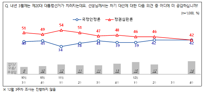 내년 대선에 대해서는 '국정 운영에 대한 심판을 위해 야당 후보에게 투표해야 한다'와 '안정적인 국정 운영을 위해 여당 후보에게 투표해야 한다'가 42%로 동률을 기록했다.