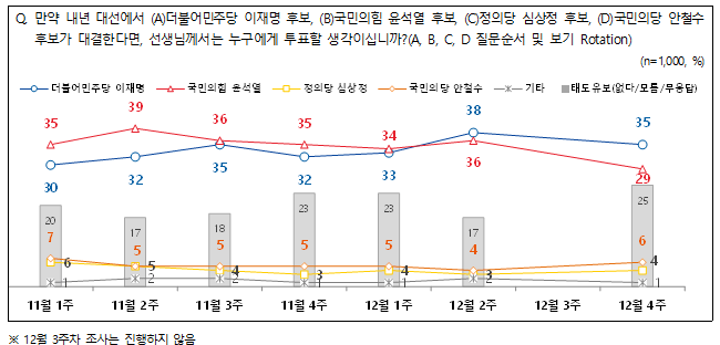 엠브레인퍼블릭·케이스탯리서치·코리아리서치·한국리서치 등 여론조사업체 4개사가 전국 만 18세 이상 1000명을 대상으로 지난 20~22일 실시한 12월 4주 차 전국지표조사(NBS) 결과, 대선 후보 지지도에서 민주당 이재명 후보는 35%, 국민의힘 윤석열 후보는 29%를 기록했다.
