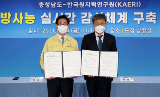 양승조 지사는 24일 도청 상황실에서 박원석 원자력연구원 원장과 ‘해양 방사능 실시간 감시체계 구축’ 업무협약을 체결했다.
