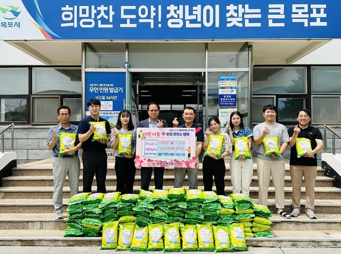 | ▲목포 엠마트 지난 27일 쌀 4kg 110포(200만원 상당)를 동명동에 기탁했다.(사진제공=목포시) |