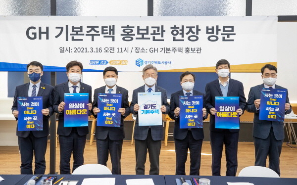 이재명 경기도지사는 16일 홍기원·이규민·이동주·김남국 의원(이상 더불어민주당), 김홍걸 의원(무소속) 등 새로운 주거모델인 기본주택에 관심이 있는 국회의원 5명과 함께 수원 광교에 있는 ‘GH 기본주택 홍보관’을 방문, 의원들과 홍보관을 둘러보며 경기도 기본주택의 개념과 필요성을 설명했다.