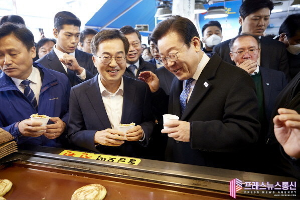 [프레스뉴스] 장현준 기자= 김동연 경기도지사가 21일 이재명 더불어민주당 대표를 비롯한 민주당 국회의원들과 전통시장을 찾아 소상공인의 목소리를 듣고 지역사랑상품권(지역화폐) 예산 반영 의지를 밝혔다.