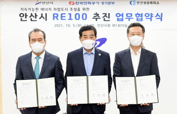 시는 5일 한국전력공사 경기본부·안산상공회의소와 ‘안산시 기업 RE100 달성·추진을 위한 업무협약’을 체결했다.