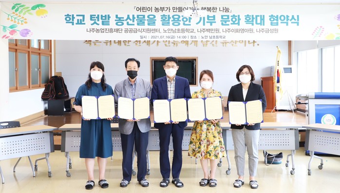 전라남도 나주시(시장 강인규)는 지난 16일 나주농업진흥재단, 노안남초등학교, 어린이복지시설(3개소) 등 5개 기관이 참여하는 ‘학교텃밭 농산물을 활용한 기부 문화 확대 협약식’을 개최했다고 19일 밝혔다.