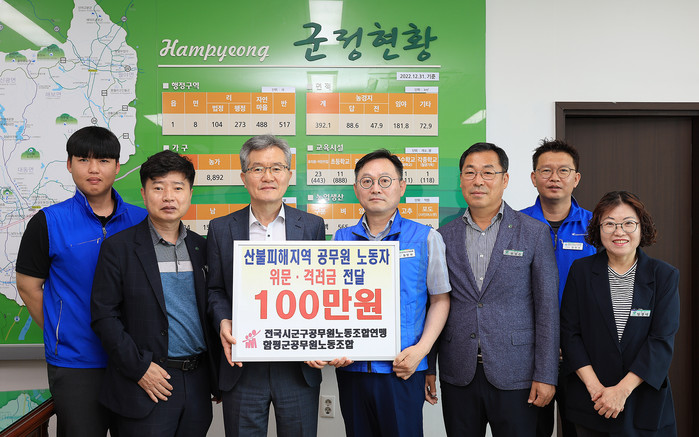 26일 군에 따르면 공무원노동조합연맹이 이날 오전 지난달 발생한 산불 진화 작업에 참여한 함평군 공무원을 격려하기 위해 100만원을 전달했다.