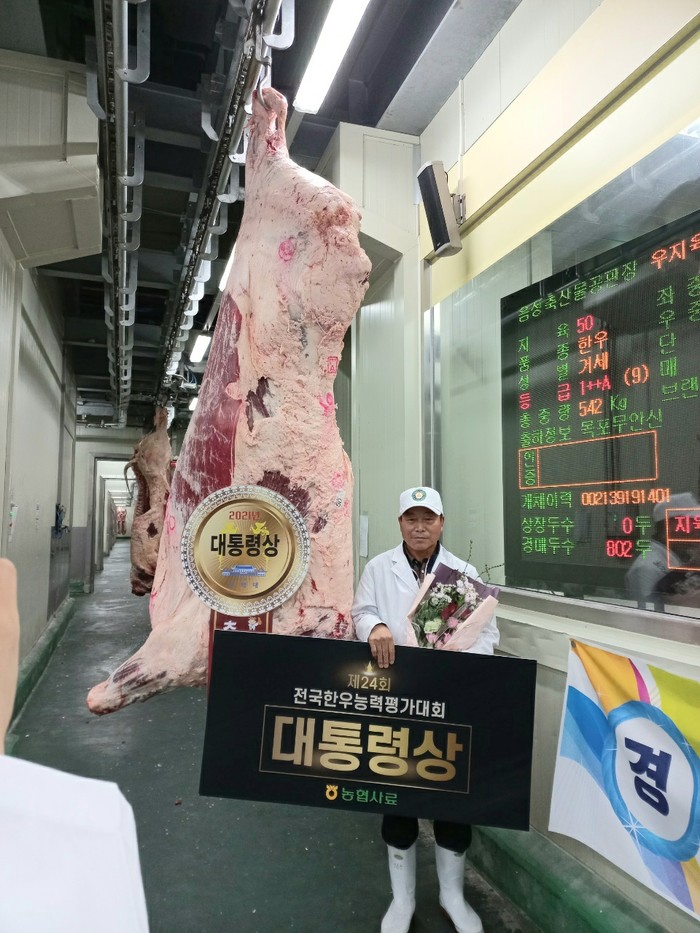 이번 대회에서 전국 최고 한우 사육농가라는 명성을 얻게 된 박성순 대표의 출품축은 출하체중 897kg에 도체중 542㎏, 등심 단면적 136㎠, 등지방 두께 11㎝, 육량지수 63.38로 최종 등급 1++A를 받아 대통령상을 수상하게 되었다.
