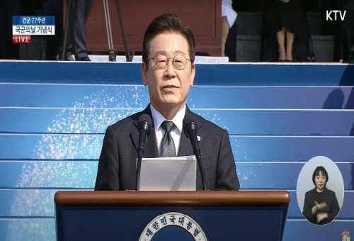 ▲이재명 대통령이 1일 오전 취임 후 첫 국군의 날을 맞아 육해공군 본부가 있는 충남 계룡대에서 열린 건군 77주년 기념식에서 기념사를 하고 있다.(사진=KTV) |