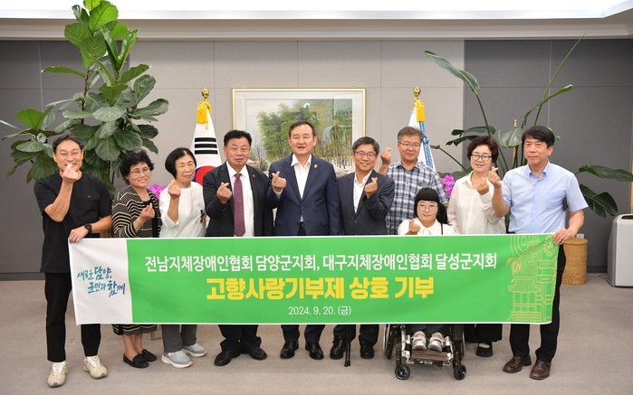 | ▲담양군-달성군 한국지체장애인협회, 고향사랑기부금 상호 기탁 (사진제공=담양군) |