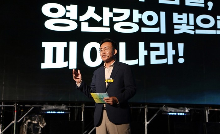 무선마이크를 착용하고 무대에 오른 윤병태 시장은 영산강 정원 조성 배경과 국가정원 지정 목표, 2024 나주영산강축제를 통해 나주가 열어갈 새로운 영산강 르네상스 시대 비전에 대해 연설했다.