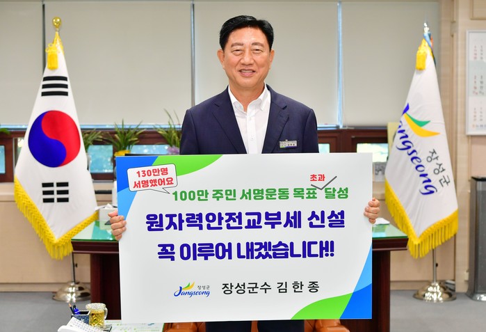 [전남=프레스뉴스] 차윤기 기자= ‘원자력안전교부세 신설 촉구 100만 주민 서명운동’에 동참한 장성군이 당초 목표를 초과 달성했다.